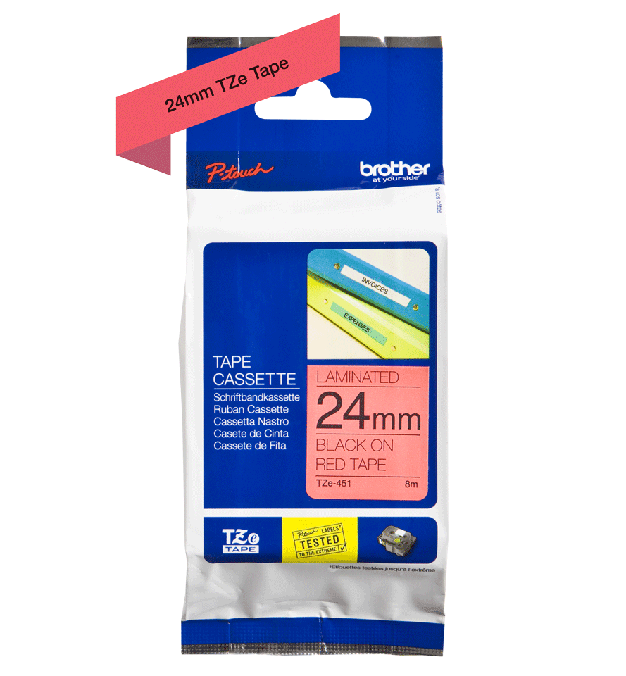 Оригинальная кассета с ламинированной лентой для печати наклеек TZe451 совместима с широкой гаммой принтеров PTouch, универсальна благодаря легко читаемым черным надписям на красном фоне и идеально подходит для дома, офиса и других мест работы.