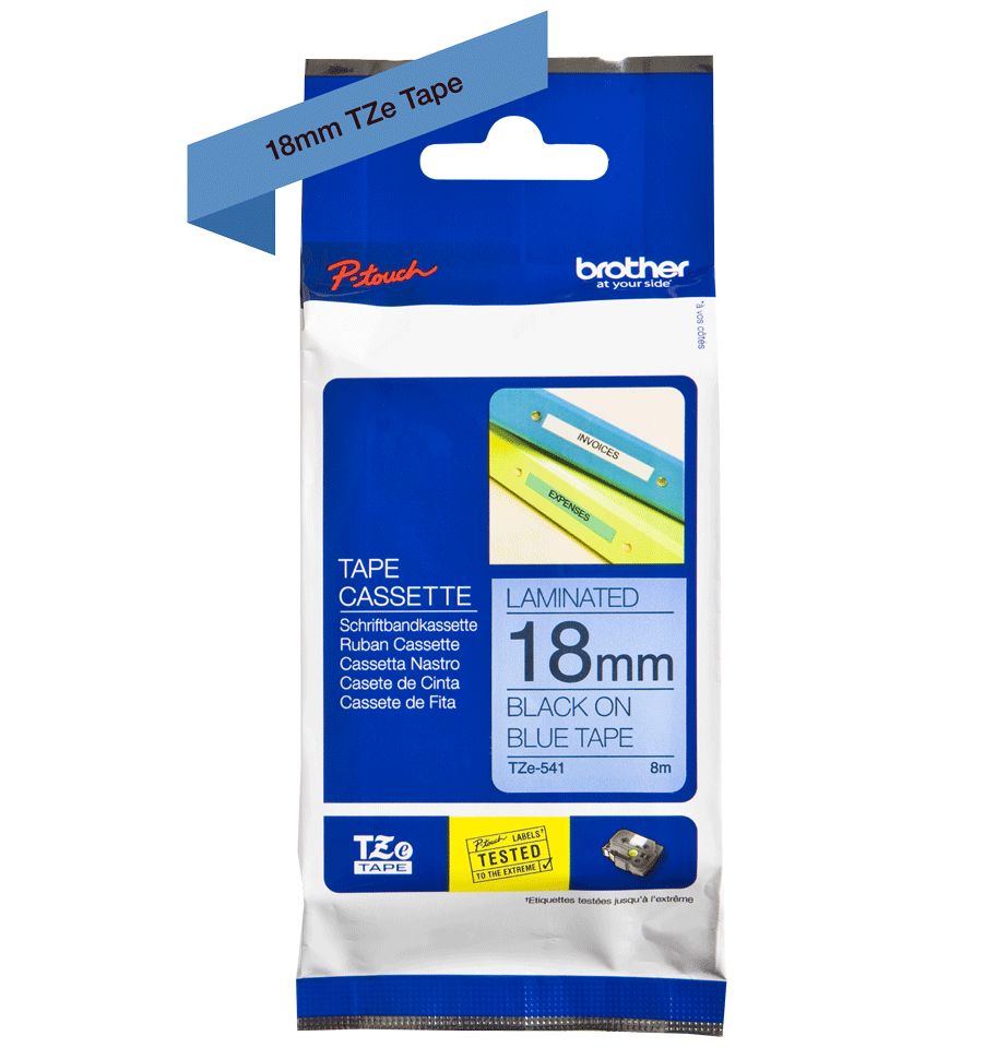Оригинальная кассета с ламинированной лентой для печати наклеек TZe541 совместима с широкой гаммой принтеров P-Touch, универсальна благодаря легко читаемым черным надписям на синем фоне и идеально подходит для дома, офиса и других мест работы.