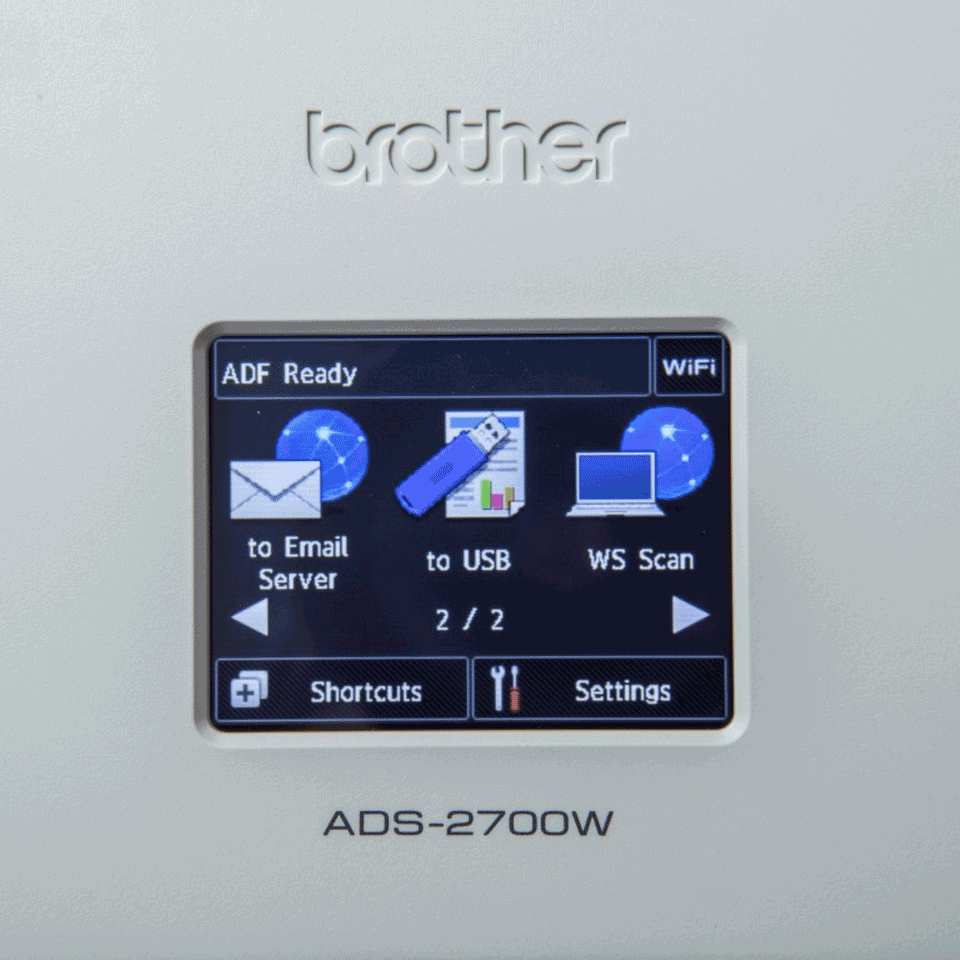 ADS-2700W ― это надёжный документ-сканер по доступной цене, оснащённый множеством функций. Пользователям данного сканера доступен Wi-Fi, проводная сеть и высокоскоростной интерфейс Hi-Speed USB 2.0, простой в использовании цветной сенсорный ЖК-дисплей, совместимость с Windows/Mac/Linux, функция сканирования на USB-хост и многое другое…